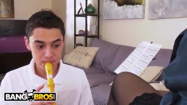 Шлюха-учительница в чулках жестко ебется с ничтожным музыкантом на полу