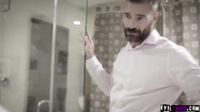 Мужик с бородой угостил горничную минетом в ванной и жестко оттрахал в позе раком
